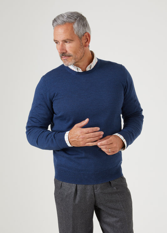 Explore our entire range of versatile blue crew neck jumpers today. These jumpers are designed with the finest fibres including cashmere, lambswool, & merino wool.